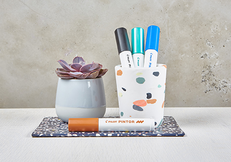 Dein chaotischer Schreibtisch macht dich wahnsinnig und es ist an der Zeit für etwas mehr Ordnung? Dann bastle dir doch einfach einen eigenen, selbst designten Terrazzo Stiftebecher. Mit etwas Modelliermasse und unserem PINTOR hast du so in kurzer Zeit einen ordentlichen Schreibtisch oder aber auch ein ideales Geschenk für Freunde und Familie.