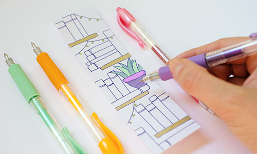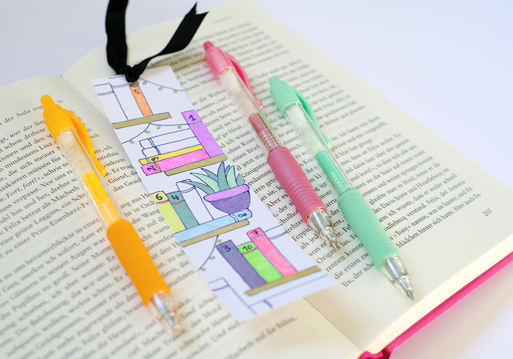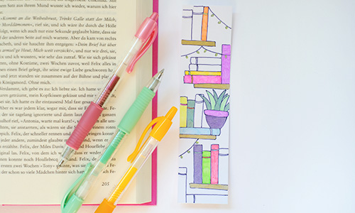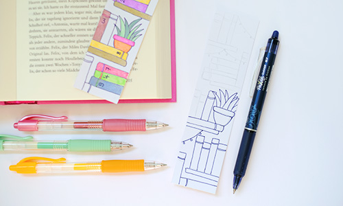Zeichne nun mit dem FriXion Clicker oder einem Bleistift verschiedene Regal-Ebenen ein, die du danach mit Büchern befüllst. Mal stehend, mal liegend oder an ein anderes Buch angelehnt. Deko-Elemente wie Lichterketten oder Planzen machen dein Lesezeichen komplett.