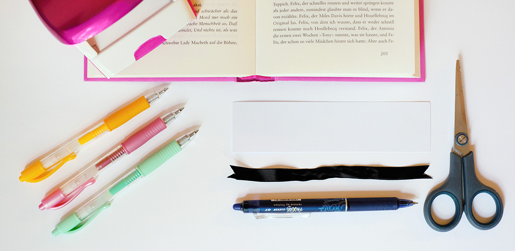 Als nächstes füllst du mit den bunten G2 alle Elemente deines Lesezeichens mit Farbe, die keine Bücher sind. Damit lassen sich sowohl feine Details als auch größere Flächen problemlos ausmalen. Lasse eine Schicht trocknen und trage bei Bedarf eine zweite auf, so wird es besonders farbintensiv.